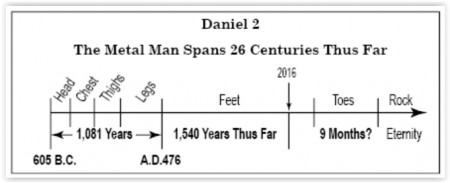 Consider the chart below and notice how the centuries unfold. The first four kingdoms span 1,081 years (from the rise of Babylon to the fall of Rome) and the kingdom of the feet spans 1,540 years thus far. When the time comes for the kingdom of the toes, I believe they will rule over the world for about nine months.